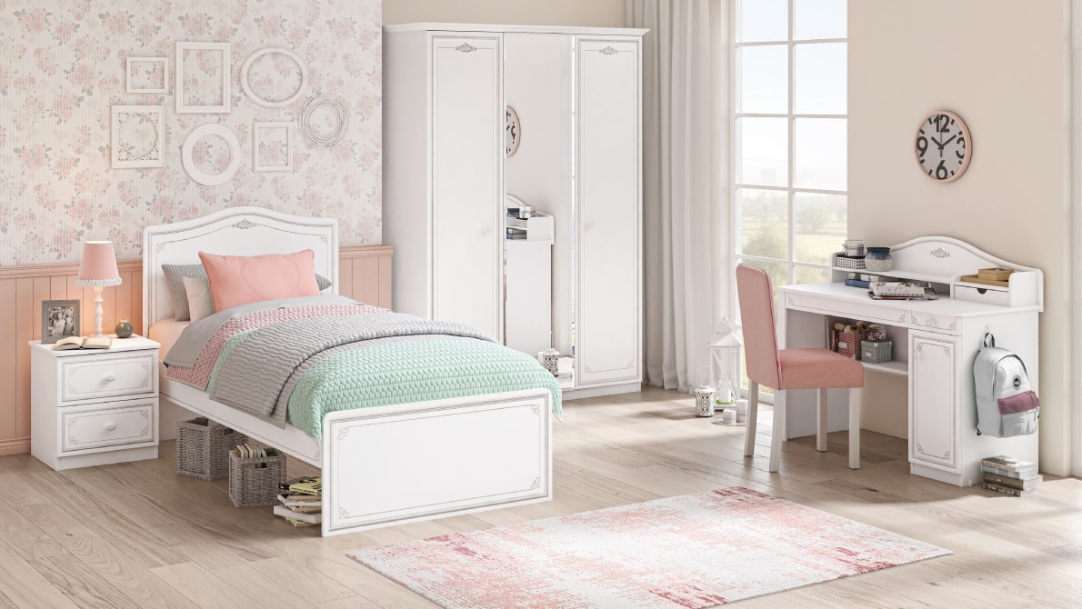 Dizajn postele Betty sa nesie v rustikálnom duchu, ktorý dodá izbe romantický nádych. Vďaka praktickej bielej farbe s jemnými šedými detailmi je posteľ ľahko kombinovateľná a skvele padne do akokoľvek farebné miestnosti. Posteľ pôsobí veľmi nadčasovým, elegantným, a napriek tomu jednoduchým štýlom. Ložná plocha je 100x200cm. Súčasťou postele je kvalitný doskový rošt, avšak matrac nie je zahrnutý v cene. Detská posteľ Betty je vyrobená z kvalitného lamina a MDF, ktoré poteší dobrou mechanickou odolnosťou a jednoduchou údržbou. Rozmery detské postele Betty sú 103x112x204cm (š, v, h). K posteli je možné zaobstarať zásuvku, ktorá poslúži ako úložný priestor alebo prístelka. Sivé detaily sú vytvorené technológiou UV printu.