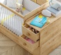 Postieľka má pohyblivú bočnicu (teleskopické priečky), ktoré sa pri manipulácii zasúvajú do seba. Vedľa ložnej časti sa nachádza prebaľovací pult s rozmermi cca 75x40cm, ktorý môžete podľa preferencií umiestniť na ľavú alebo pravú stranu. Pod pultom nájdete z tri zásuvky s hladkým dojazdom a z druhej strany je otvorený priestor s policou. Tieto úložné priestory sú veľmi praktické v prvých rokoch bábätka. Do úložných priestorov pultu báječne uskladníte všetky potreby na prebaľovanie a starostlivosť a bábätko tak nemusíte nikam prenášať. Výška pultu od podlahy je 77,7cm.