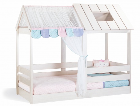 Montessori posteľ Boom poskytne dieťaťu veľký komfort vďaka lôžku blízko podlahy a zábranám chrániacim proti pádu. Radosť bude robiť aj útulné domčekové prevedenie s krytou strieškou. Časť striešky z lamina je spestrená výrezom okienka, druhú časť striešky tvorí krajková moskytiéra, ktorú je možné ľahko odňať a vyprať. Posteľ je vybavená doskovým roštom tvoreným dvoma dielmi, nosnosť je 100 kg, priestor pre matrac je 100x200cm. Matrac v tomto rozmere sa dokupuje samostatne. Posteľ je prevedená v dekore breza.