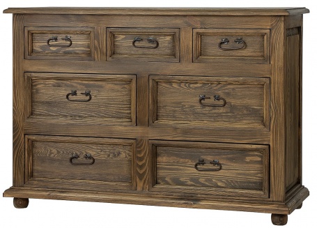 Poctivá práca, pravé drevo a vôňa včelieho vosku: Nechajte na seba dýchnuť masívny nábytok z borovice. Tešiť vás bude dlhé roky! Drevená komoda je pritom nielen luxusným bytovým doplnkom, ale tiež poskytuje veľa úložného priestoru v zásuvkách. Výrazným prvkom sú tiež veľmi dekoratívne kovové úchyty. Kovanie na prepracovaných úchytoch je ozdobené umeleckou patinou. Dna zásuviek sú vyrobené z farebnej preglejky. Sedliacky nábytok z masívu ponúkame v niekoľkých odtieňoch morenia, od svetlo bielej až po tmavo hnedu. Ošetrený je pravým včelím voskom, čo z neho robí luxusný ekologický nábytok. Navyše môžete zvoliť tiež preferovaný druhý odtieň, ktorý sa použije na hornú dosku nábytku. Lakovaným morením hornej dosky sa stane vrchná doska ešte odolnejšie. Vzory si prezrite vo fotogalérii. Aj tento sedliacky nábytok je ručne vyrábaný a pri jeho výrobe je kladený veľký dôraz na detaily spracovanie. Vďaka ručnú prácu a masívnemu drevu je každý kus nábytku jedinečný. Ponuka nábytku z masívnej borovice je veľmi široká - pozrite si súvisiaci tovar nižšie alebo priamo kategórii "sedliacky nábytok". Zaujať by vás mohol tiež "rustikálny nábytok". Vo vrchnej časti stránky si v poli "Vybrať variantu" vyberte odtieň korpusu. Chrbát nábytku a dna šuplíkov sú z drevovláknité dosky (preglejky), ktorá nie je namorená v rovnakom odtieni ako korpus.