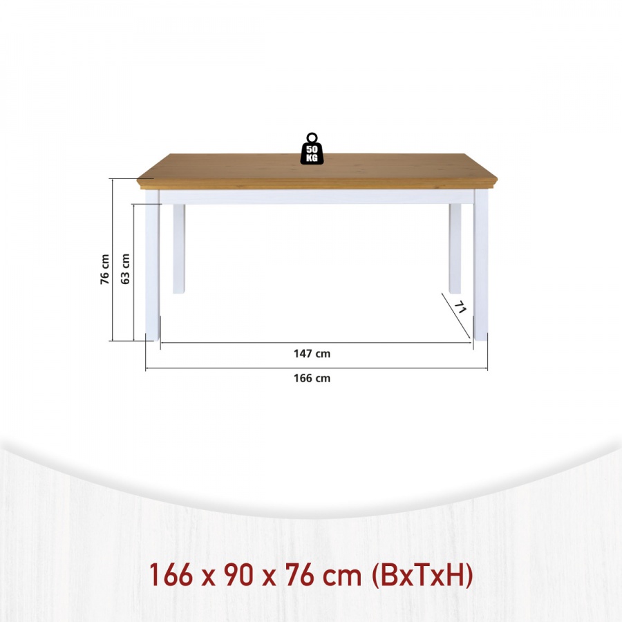 Rozmery 166,4 × 90 × 76 cm (š × h × v) poskytujú komfortný priestor pre rodinné stolovanie aj stretnutie s priateľmi.