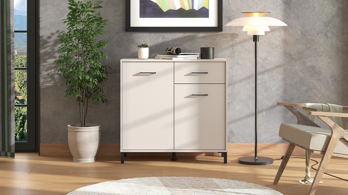 Kombinované komody sú praktické, dostatočne priestranné, a navyše veľmi univerzálne, pretože skvele zapadnú do každej miestnosti. Ich využitie je tak takmer neobmedzené. Komoda je opatrená 2 dvierkami za ktorými nájdete priestory rozdelené policou. V pravom hornom rohu sa nachádza zásuvka. Kašmírový odtieň je ideálnou voľbou pre tých, ktorí milujú svetlý nábytok, ale zároveň chcú svoj domov ozvláštniť originálnejšou farbou.