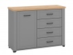 Kombinovaná komoda ponúka úložné priestory vo forme 4 zásuviek a 1 skrinky kryté dvierkami. Usadená je na drobných nôžkach, ktoré sú zladené do rovnakej čiernej farby ako úchytky. Profilované čelá dvierok a zásuviek sú z MDF dosky a pokryté šedou matnou fóliou. Korpus celej komody je vyrobený z lamina v šedej farbe.