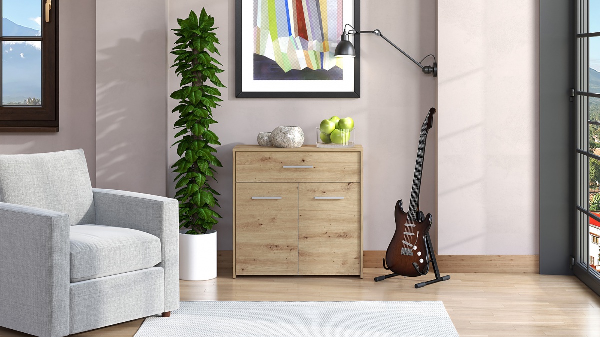 Komoda je opatrená jednou širokou zásuvkou a dvierkami za ktorými sa skrývajú dve priehradky. Štýlové úchytky v šedej farbe dodajú každému kúsku jedinečnosť a navyše perfektne ladia s dekorom duba artisan. Zaobstarajte si praktický kúsok, ktorý je navrhnutý tak, aby Vám poskytol všetko potrebné miesto pre Vaše oblečenie.