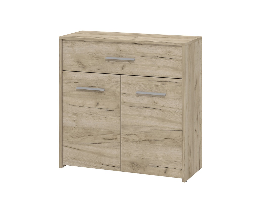 Komoda je opatrená jednou širokou zásuvkou a dvierkami za ktorými sa skrývajú dve priehradky. Štýlové úchytky v šedej farbe dodajú každému kúsku jedinečnosť a navyše perfektne ladia s dekorom dubu šedého. Zaobstarajte si praktický kúsok, ktorý je navrhnutý tak, aby Vám poskytol všetko potrebné miesto pre Vaše oblečenie.