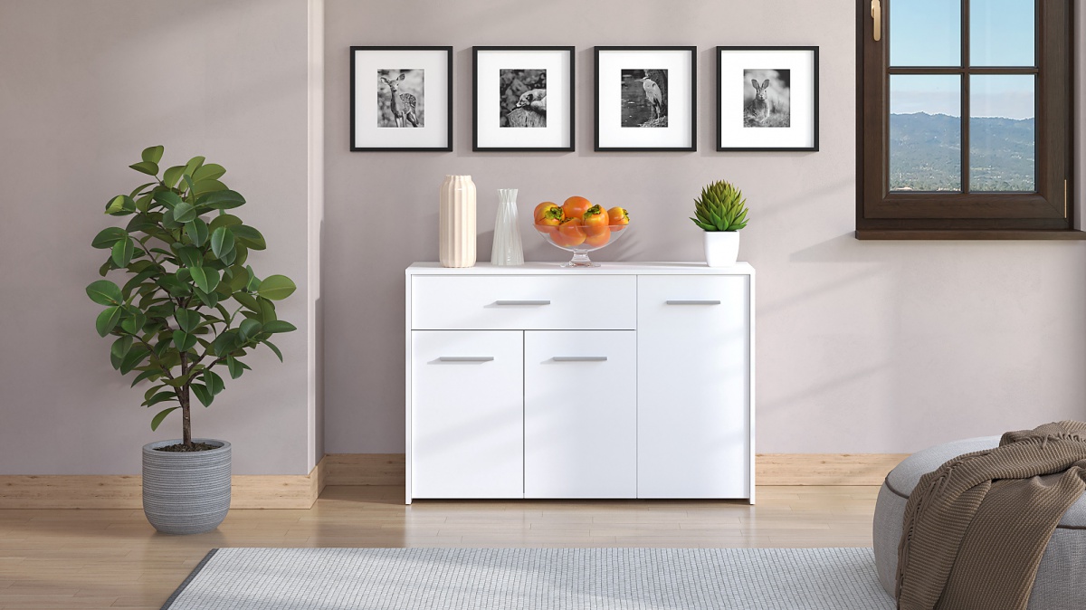 Komoda je opatrená dvierkami za ktorými sa skrývajú priehradky a širokou zásuvkou. Štýlové úchytky v šedej farbe dodajú každému kúsku jedinečnosť a navyše perfektne ladia s bielou farbou. Zaobstarajte si praktický kúsok, ktorý je navrhnutý tak, aby Vám poskytol všetko potrebné miesto pre Vaše oblečenie.