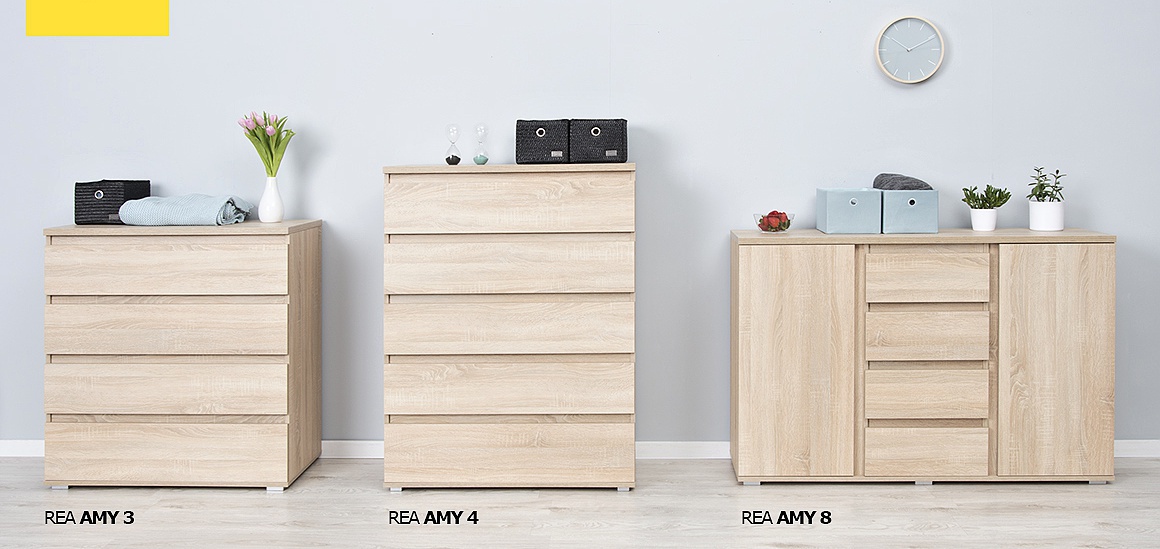Komoda REA Amy 2 v odtieni buk má hrúbku hornej dosky 25 mm a ABS hranu 2 mm. Ostatné dosky majú hrúbku ABS hrany 0,5 mm. Skladá sa z troch šuplíkov. Rozmery komody sú: 73,8x90x49cm (v, š, h.) Ku komode si môžete objednať farebnú lištu F-1ks + K-2ks z UNI farieb. Podobný tovar nájdete v kategórii Komody so zásuvkami.
