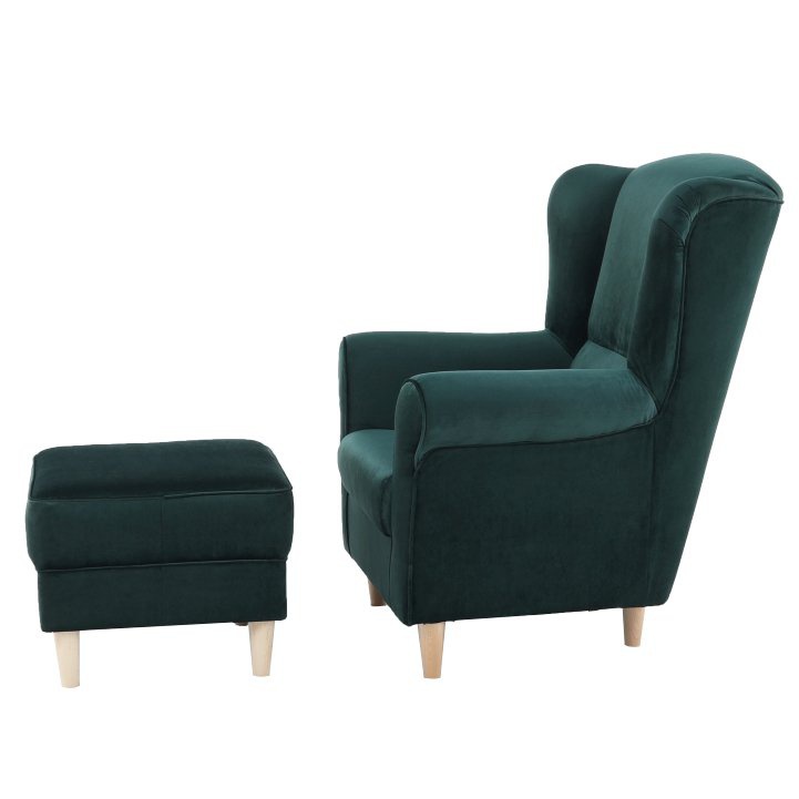 Kreslo ušiak, s taburetom, látka smaragdová, ASTRID