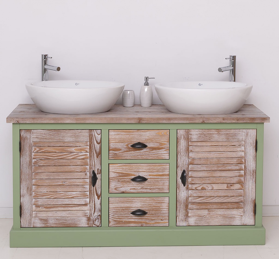 Priestranná kúpeľňová skrinka bola navrhnutá s ohľadom na potreby modernej domácnosti. Vďaka priestoru na 2 umývadlá sa zlepšuje každodenný komfort a ranné čakanie, až prídete s čistením zubov na rad, sa mnohonásobne skracuje. V prostrednej časti skrinky nájdete tri zásuvky do ktorých ľahko ukryjete každodenné hygienické potreby. Z každej strany drží stráž dvierka za ktorými nájdete dve priestranné priehradky. Dajte zbohom neporiadku okolo umývadla a nekonečnému hľadaniu každodenných potrieb. Zelený základ skrinky fantasticky ladí s hornou doskou v prirodzenom hnedom odtieni.