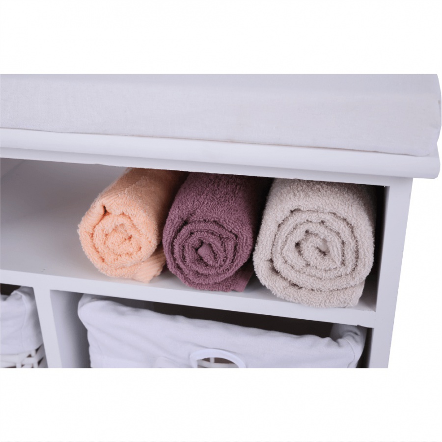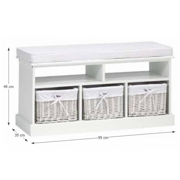 Potrebujete nejaký nábytok, ktorý by bol vhodný do každého interiéru a doplnil ho svojim originálnym štýlom? Ponúkame vám lavicu RAFAELLO ideálnu na skladovanie a triedenie rôznych predmetov. Je to krásny doplnok do vašej predsiene, spálne či kúpeľne. Vyrobená je z masívneho dreva v kombinácii s prútím a látkou vo farebnom prevedení biela. Skladá sa z pevného rámu a troch prútených košíkov. K dispozícii sú aj dva otvorené úložné priestory. Poponáhľajte sa! Toto je super príležitosť, ako si zútulniť váš domov. Nosnosť lavice je 90kg. Výrobok je dodávaný v demonte.