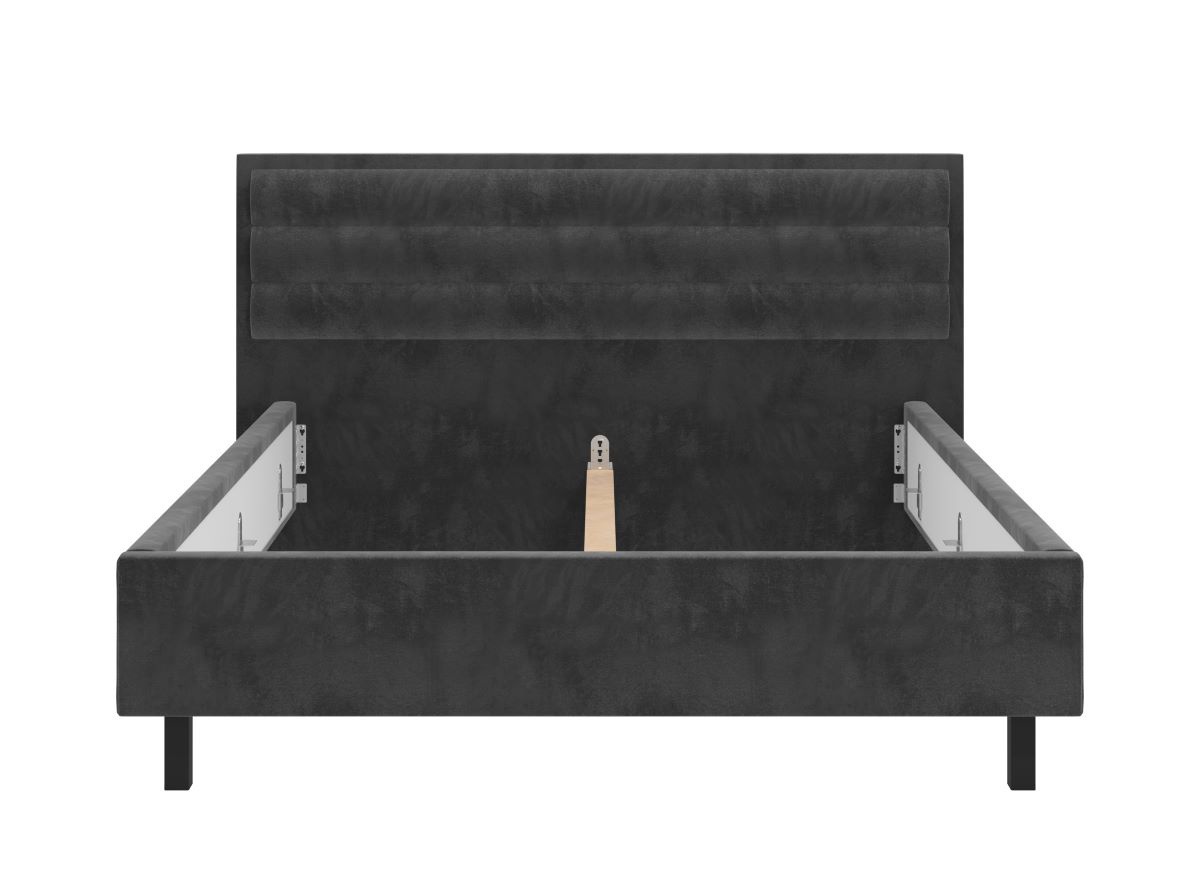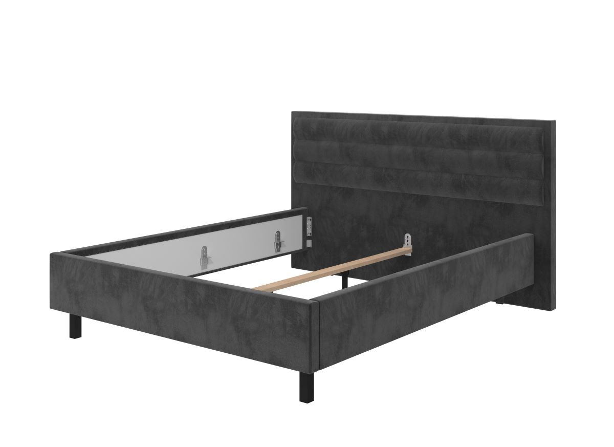 Krásna čalúnená posteľ v modernom prevedení vám vďaka svojmu vysokému čelu prináša extra pohodlie pri čítaní knihy pred spaním, a tiež vďaka nohám prispieva k lepšej cirkulácii vzduchu v miestnosti a ľahšiemu upratovaniu. Posteľ je celočalúnená a použitá látka v tmavo šedom odtieni nesie označenie MONOLITH 95. Hlavné čelo je polstrované a zdobené vodorovným prešívaným v troch pruhoch. Tento variant postele Corey má čierne nohy.