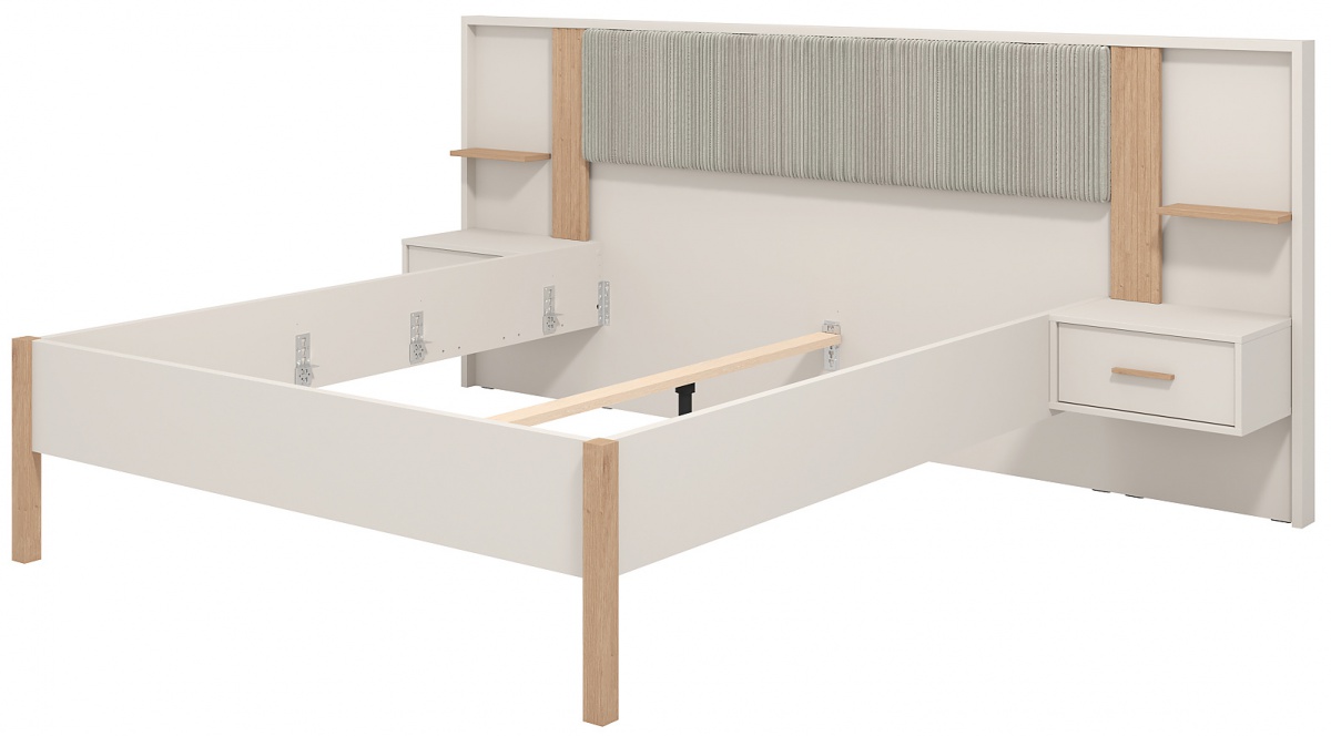 Manželská posteľ, ktorá je taká pohodlná, až je to na zbláznenie? To jednoducho chcete! Minimalistický dizajn v béžovom odtieni je doladený nôžkami v dekore duba artisan ak dokonalosti všetko doťahuje polstrované čelo. Každý deň sa tak môžete pohodlne oprieť a odpočívať. Súčasťou čela sú dva závesné nočné stolíky a poličky. Stabilná a odolná konštrukcia zaručuje dlhú životnosť. Posteľ je dodávaná bez roštu a bez matraca, vhodné typy nájdete nižšie v súvisiacich produktoch. Po vytvorení ďalšieho úložného priestoru môžete dokúpiť úložnú zásuvku, ktorá sa ukladá pod prednú časť postele. Túto posteľ ponúkame aj vo variante s osvetlením.