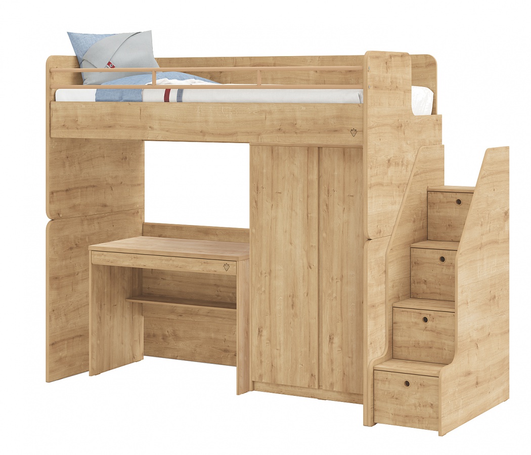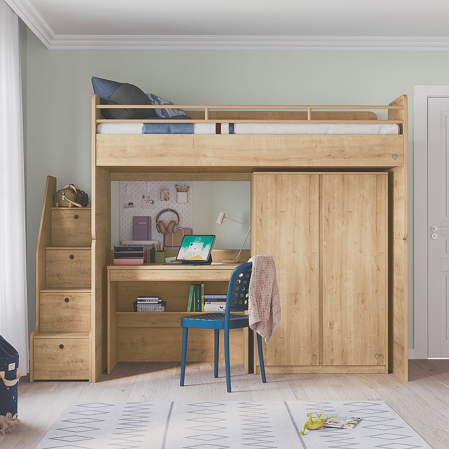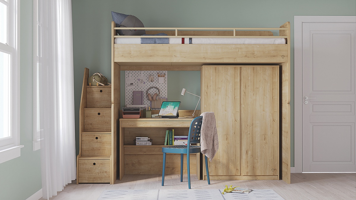 Multifunkčná posteľ Modular ponúka inteligentné riešenie nielen pre menšie priestory. Obsahuje jedno vyvýšené lôžko, pod ktorým sa nachádza písací stôl spolu s úložným priestorom v podobe šatníkovej skrine. Stôl ponúka priestrannú zásuvku aj policu a vytvára tak funkčný študijný kút. Skriňa za svojimi bezúchytkovými dvierkami ukrýva priestor so šatníkovou tyčou aj police. Čelá postele sú vybavené výkrojmi, do ktorých je možné umiestniť úzky úložný box. Na bočnej strane sú umiestnené schodíky, ktoré v sebe ukrývajú jednotlivé priehradky za výklopnými dvierkami. Zaoblené hrany a rohy maximalizujú bezpečnosť vás aj vašich detí a príjemne ladí s laminom v dekore dubového dreva. Veľkosť lôžka je 90x200cm a matrac nie je súčasťou postele a je nutné ho dokúpiť. Rošt postele je doskový, zložený z troch samostatných dosiek, každá z dosiek má dva vetracie otvory na prísun vzduchu k matracu. Maximálna nosnosť jedného lôžka je 130kg.