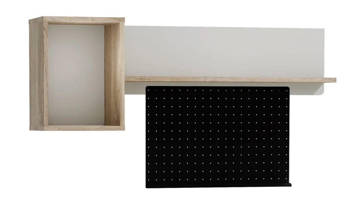 Táto dizajnová nástenná polica Kaylla prepája teplý dekor duba Sofia s čistou bielou plochou a výrazným čiernym perforovaným panelom pre maximálnu funkčnosť aj štýl. Otvorený box v dekore duba je ideálny na knihy a dekorácie, zatiaľ čo dlhá biela polica ponúka ďalší odkladací priestor. Čierny dierovaný panel umožňuje prehľadnú organizáciu drobností – môžete naň zavesiť háčiky, košíky či držiaky (podľa zvoleného príslušenstva).