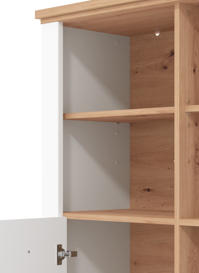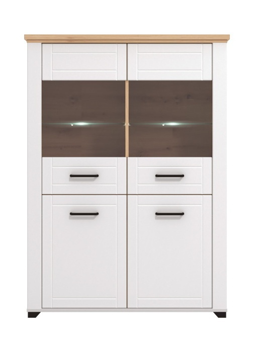 Nízka vitrína vytvorí kúzelný úložný priestor v obývacej izbe. Poskytuje priestor v 4 skrinkách krytých dvierkami. Horné skrinky sú presklené a obsahujú každá 1 sklenenú policu. Tieto police sú osvetlené LED osvetlením, ktoré oceníte hlavne v podvečer, kedy vykúzli príjemnú atmosféru pri posedení v pohodlí domova. Spodné skrinky obsahujú každá 1 vnútornú policu. Korpus vitríny je tvorený laminom potiahnutým bielou matnou fóliou. Na dvierkach sú nainštalované praktické čierne rukoväte, ktoré krásne korešpondujú s nôžkami vitríny. Horná rímsa je taktiež tvorená laminom avšak v dekore duba artisan.