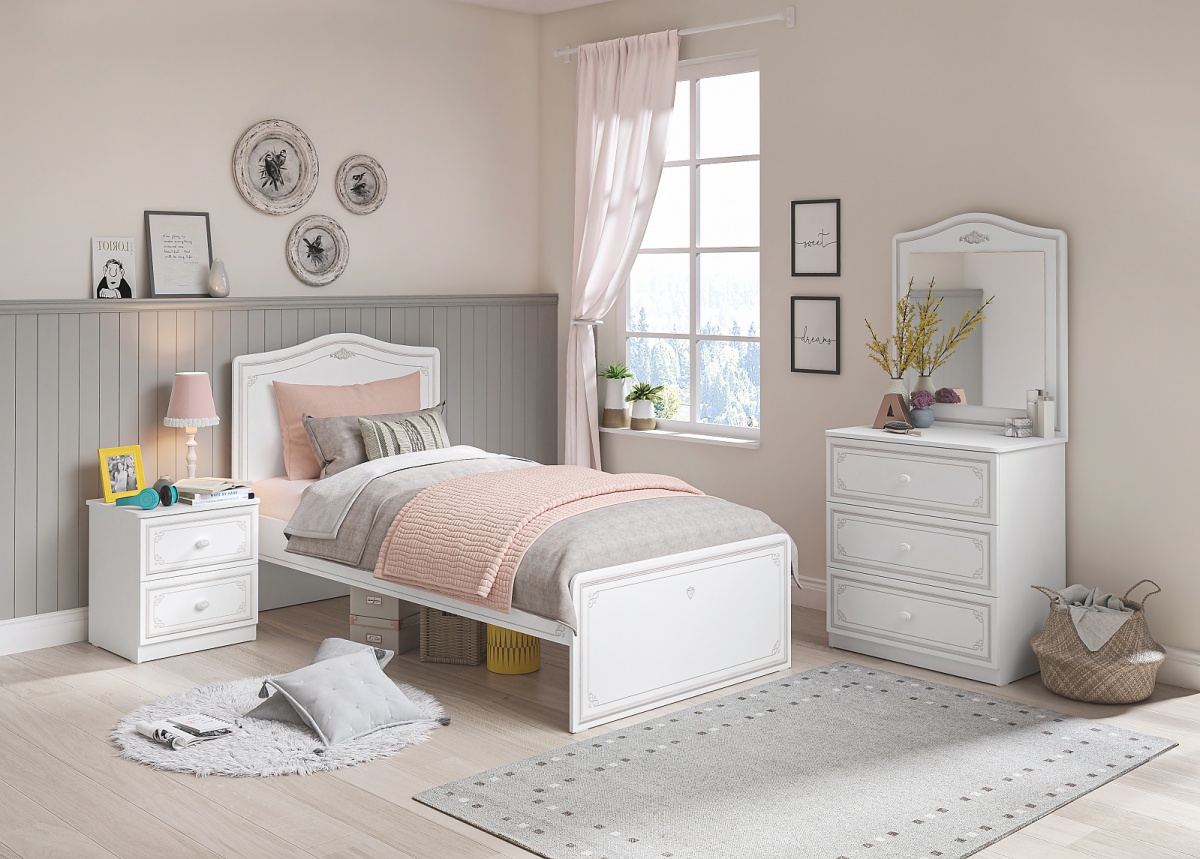 Dizajn stolíku sa nesie v rustikálnom duchu, ktorý dodá izbe romantický nádych. Vďaka praktickej bielej farbe s šedými detailmi je stolík ľahko kombinovateľný a skvele padne do akokoľvek farebné miestnosti. Stolík pôsobí veľmi nadčasovým, elegantným, a napriek tomu jednoduchým štýlom. Nočný stolík Betty je vyrobený z kvalitného lamina a MDF, ktoré poteší dobrou mechanickou odolnosťou a jednoduchou údržbou. Rozmery nočného stolíka Betty sú 47x54x46cm (š, v, h). Sivé detaily sú vytvorené technológiou UV printu.