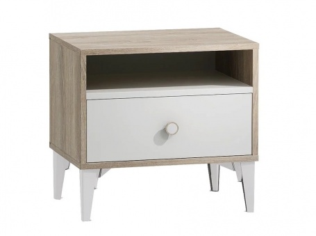 Nočný stolík Kaylla spája teplý dekor duba Sofia s čisto bielymi prvkami, vďaka čomu pôsobí elegantne a vzdušne.