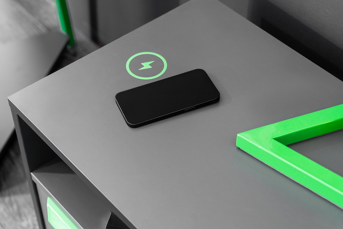 Povrchy sú potlačené UV lakom, čo ich robí odolnými voči vode a vyblednutiu. To je ideálne do dynamického prostredia hernej izby. Zásuvka je vybavená tlmeným koľajnicovým systémom pre tiché a bezpečné používanie, zatiaľ čo otvorený horný úložný priestor je praktický na veci, ktoré potrebujete mať poruke. Vďaka bezdrôtovej nabíjacej stanici si vaše mobilné zariadenia jednoducho dobijú batériu na ďalší deň, čo je obzvlášť užitočné pre hráčov. V policovej sekcii je integrované diaľkovo ovládané LED osvetlenie, ktoré dodáva stolíku modernú atmosféru.