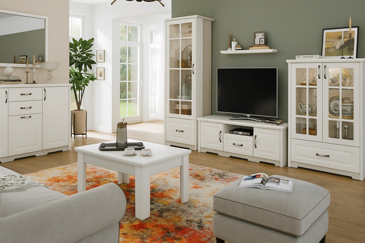 Luxusná rustikálna zostava nábytku do obývačky. Jedinečný dizajn na čele s profilovanými čelami a dekoratívnymi lištami sa nesie v tónoch bielej farby a svetlého dekoru borovicového dreva.
