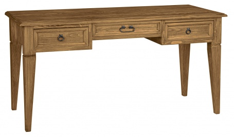 Doska stola je mierne zaoblená a frézovaná, čo dodáva jemnosť a eleganciu. Praktické úložné priestory zahŕňajú dve zásuvky po stranách a jednu väčšiu zásuvku uprostred, ktoré poskytujú dostatok miesta na uloženie drobností, dokumentov alebo kancelárskych potrieb. Aj keď zásuvky nemajú kovové vodítka, je možné objednať verziu s vodidlami, ktorá zvyšuje komfort používania.