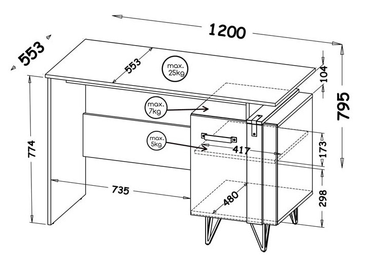 Horná pracovná doska písacieho stolíka príjemný rozmer 120x55,3cm a nosnosť až 25kg. S kľudom tu teda môžete umiestniť napríklad aj počítač. Pod hlavnou pracovnou plochou vás stolík poteší úložným priestorom v podobe skrinky. Za dvierkami delia priestor jedna polica, nie v polovici ale 29,8cm ku 17,3cm na výšku. Pričom horná časť je tá užšia. Deliace poličku možno zaťažiť 5kg. Priestor medzi hornou doskou a skrinkou je 10,4cm, môžete si tu odložiť napríklad dokumenty či papiere čo potrebujete mať po ruke. A môžu to byť pokojne aj knihy, pretože na hornú dosku skrinky možno odložiť až 7kg.