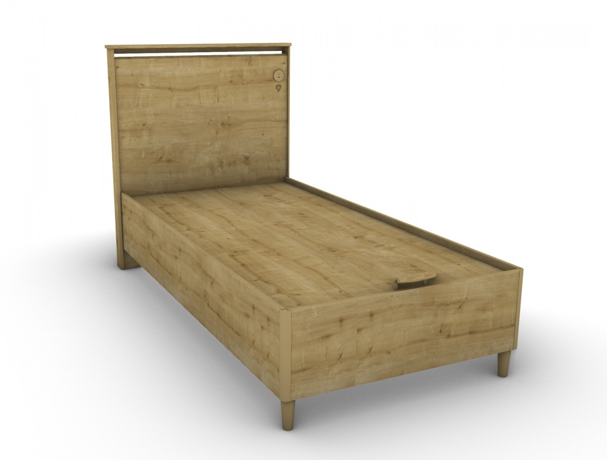 K posteli patrí krásne zadné čelo, ktoré je v pravom rohu významne obohatené o USB port typu C so zapojením do zásuvky. Vrch čela je navyše rozšírený tak, aby tvoril poličku, takže si naň môžete položiť nabíjaný telefón alebo malú dekoráciu. Najväčšou výhodou však je obrovský úložný priestor v spodnej časti postele, ktorý je možné využiť podľa ľubovôle na mimosezónne oblečenie, lôžkoviny, hračky a pod. Prístup je jednoduchý po odklopení roštu pomocou komfortnej rukoväte. Spätné dovieranie roštu je tiché a tlmené. Predná časť postele je podoprená 12cm vysokými nôžkami.