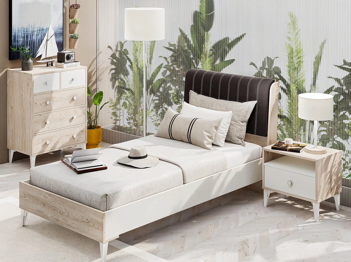 Posteľ Kaylla spája teplý dekor duba s čisto bielymi akcentmi a vytvára vzdušný, elegantný prvok do detskej či študentskej izby. Vysoké čalúnené čelo so zvislým prešívaním poskytuje príjemnú oporu pri čítaní alebo práci na notebooku, zatiaľ čo štíhle nožičky v bielej farbe odľahčujú siluetu a uľahčujú upratovanie, vrátane prejazdu robotického vysávača.