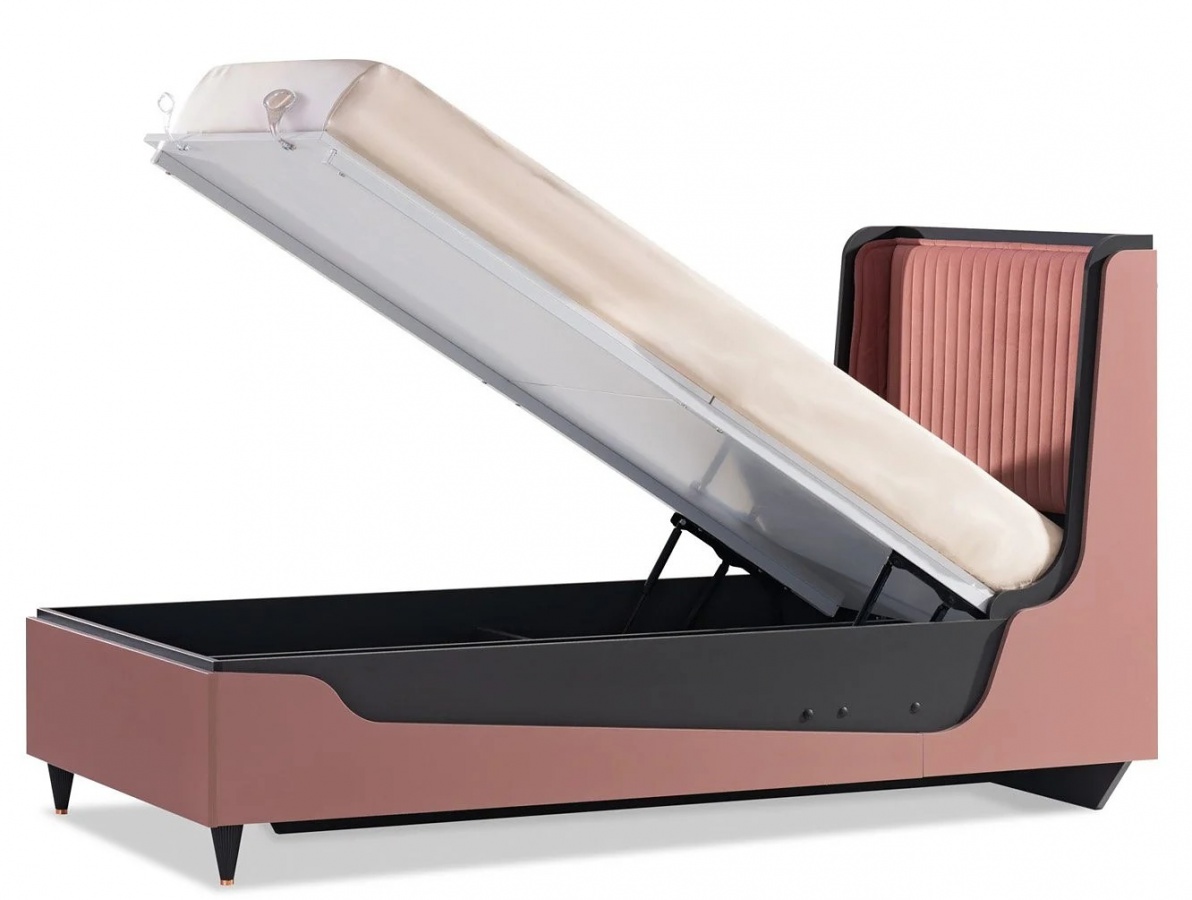 Čelo postele je čalúnené ružovým 100% PES zamatom s prešívaným vzorom, čo dodáva rámu postele elegantný a štýlový vzhľad. Zaoblené rohy čela postele pridávajú jemnosť a eleganciu celkovému dizajnu. Nohy rámu postele a detaily v farbe ružového zlata zvýrazňujú jej štýlový vzhľad.