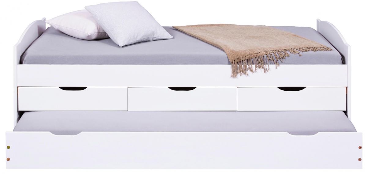 Túžite po štýlovej, ale praktickej študentskej posteli, ktorá má čo ponúknuť? Super praktická posteľ Janett je funkčná a uľahčí Vám život. Študentská posteľ je vybavená tromi zásuvkami, ktoré pojmú mnoho vecí. Pod nimi sa nachádza ďalšia zásuvka, ktorú je možné využiť ako prístelku. Výška matraca v tomto prípade nesmie presiahnuť 12cm. Inak ju možno využiť ako obyčajný úložný priestor. Posteľ je vyrobená z masívneho borovicového dreva a jej povrch bol upravený bielym lakom. Vďaka tejto úprave je ľahko viditeľná kresba dreva. Súčasťou postele je lamelový rošt, matrac je ale potrebné zakúpiť samostatne. Vhodné typy nájdete nižšie v súvisiacich produktoch. Nosnosť lôžka je 100kg.