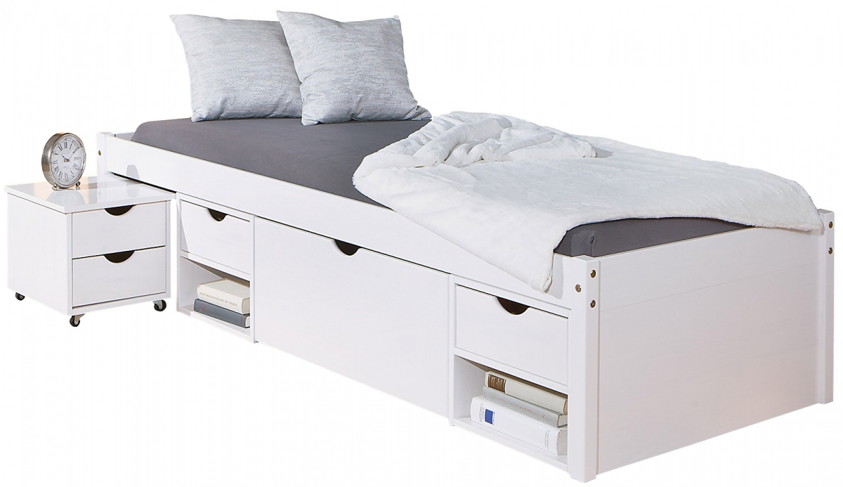 Túžite po štýlovej, ale praktickej študentskej posteli, ktorá má čo ponúknuť? Posteľ z kolekcie Diablo je božskou voľbou do každej domácnosti, nehľadiac na štýl interiéru. Jedná sa o super praktickú posteľ, ktorá je funkčná a uľahčí Vám život. Je opatrená výsuvným nočným stolíkom na kolieskach, takže s ním môžete ľahko manipulovať. Určite oceníte aj dve zásuvky, ktoré sa v ňom nachádzajú. Zo strany nájdete hlbokú zásuvku, potom dve malé, a ešte dve priehradky. Zásuvky si môžete podľa ľubovôle prekladať, a vytvoriť tak naozaj unikátny a osobitý kúsok. Úložného priestoru táto posteľ ponúka naozaj veľa a je prispôsobená tak, aby čo najviac vyhovovala vašim požiadavkám a nárokom. Povrch dreva bol upravený bielym lakom. Vďaka tejto úprave je ľahko viditeľná kresba dreva. Súčasťou postele je lamelový rošt, matrac je ale potrebné zakúpiť samostatne. Vhodné typy nájdete nižšie v súvisiacich produktoch.