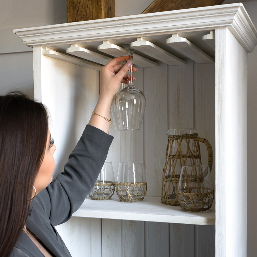 Máte radi dobré pitie? Potom je tento regál určený hlavne pre vás! V hornej časti sú špeciálne zarážky na poháre na víno a tiež police. V spodnej časti sú priehradky pre uloženie fliaš. Uprostred regálu je malý šuflík. Regál ponúka dostatok úložného priestoru a pritom sám pôsobí veľmi dekoratívne. Kvalitné spracovanie a poctivé borovicové drevo sú zárukou dlhovekosti. Regál, vyrobený výhradne z masívneho borovicového dreva, je ošetrený prírodným včelím voskom, ktorý ho povyšuje na luxusný ekologický nábytok. Využitie nájde nielen v jedálni, ale aj v kuchyni, v hale či v obývacej izbe. Sedliacky nábytok ponúkame v niekoľkých odtieňoch morenia, od svetlo bielej až po tajomne čiernu.