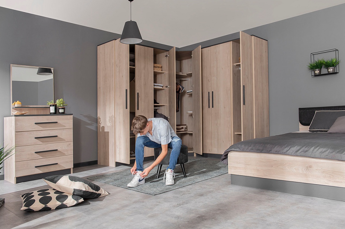 Rohová šatníková skriňa ponúka police a jednu šatníkovú tyč. Ide o skvelú voľbu do atypických miestností či domov, kde chcete využiť každé voľné miesto. Okrem spální a izieb sa výborne hodí aj do predsiení či šatní. Pri skriniach Colin určite oceníte ich kompatibilitu, pretože ich medzi sebou môžete ľubovoľne kombinovať alebo neskôr dokupovať. Vždy k sebe fantasticky padnú.