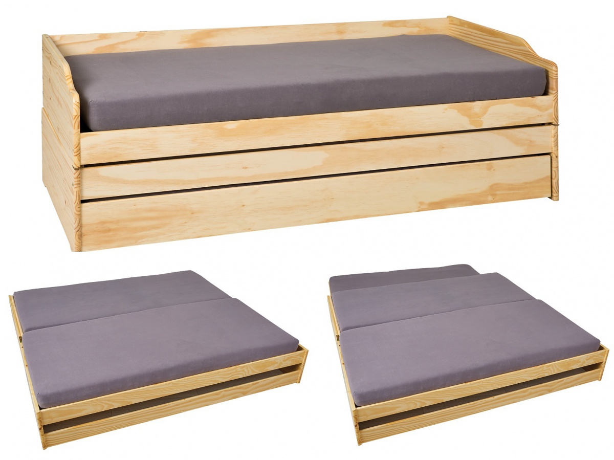 Rozkladacia posteľ, ktorá nemá obdoby. Cieľom kolekcie Tulip bolo vytvoriť kúsky, ktoré budú praktické a predovšetkým skladné. Dá sa povedať, že sa jedná o posteľ 3v1, pretože ponúka tri rôzne možnosti využitia. Horné lôžko 90x200cm je ideálnou voľbou na každodenné prespávanie. Potrebujete niekam ubytovať hostí? Potom jednoducho posteľ rozložte a vznikne Vám dvojlôžko o približnej veľkosti 180x200cm. A pokiaľ dorazí aj nejaké dieťa, tak oceníte aj zásuvku, ktorá slúži ako prístelka. Posteľ bola vyrobená z masívneho borovicového dreva, ktorého povrch bol upravený prírodným lakom. Táto povrchová úprava ešte viac zvýrazňuje prirodzené kresby dreva. Súčasťou postele sú lamelové rošty, matrac je ale potrebné zakúpiť samostatne. Pre správnu funkciu postele odporúčame matrac do max. výšky 11cm. Vhodné typy nájdete nižšie v súvisiacich produktoch.