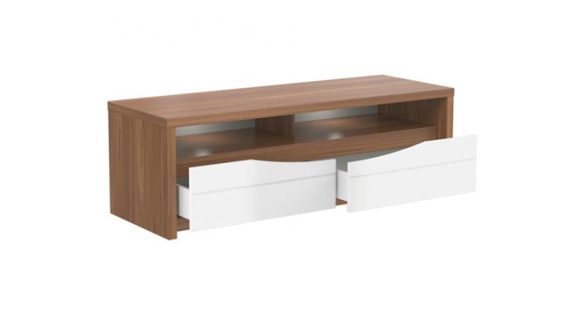 RTV stolík Saint Tropez je vyrobený z kvalitného lamina vo farbe dub sangallo / biely lesk, pričom korpusy sú v odtieni dub sangallo a čelné plochy v bielom lesku. Súčasťou stolíka sú 2 šuplíky, nad ktorými je otvorený úložný priestor na umiestnenie prehrávačov alebo iných TV doplnkov.