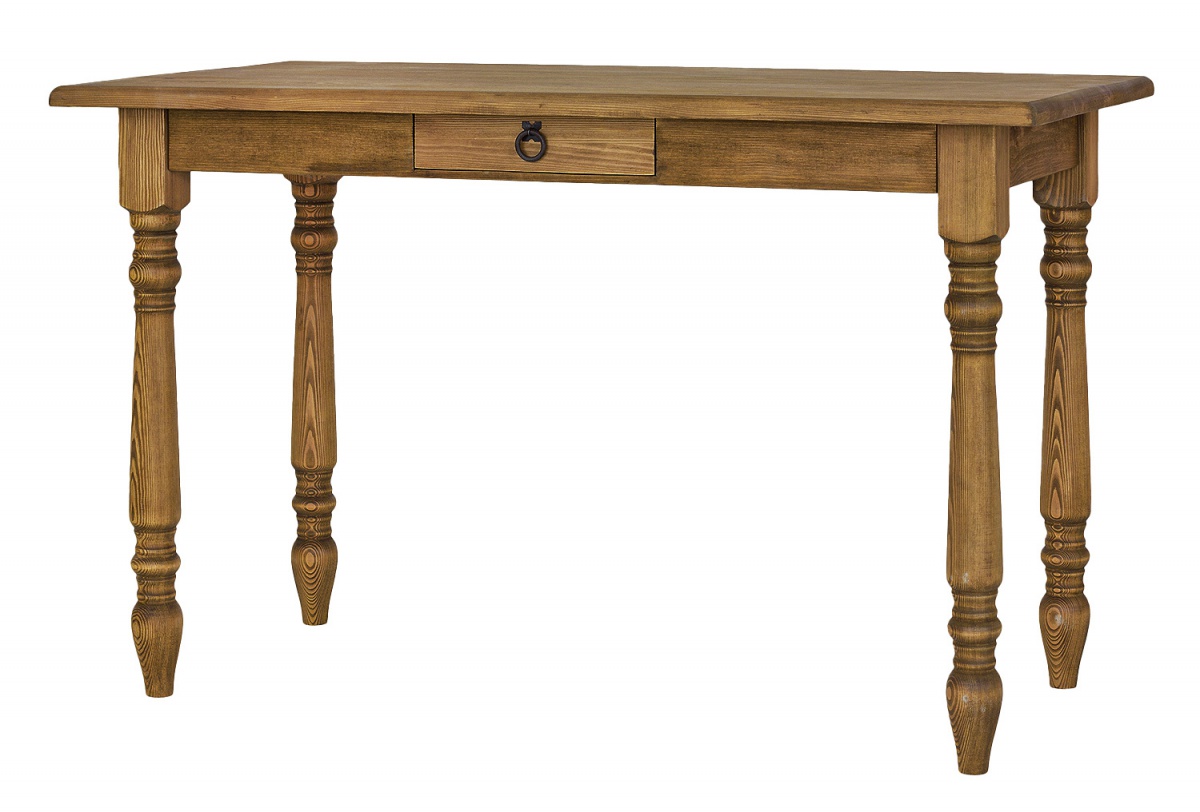 Pevný masívny borovicový stôl má odolnú a spoľahlivú konštrukciu. Skladá sa zo silných nôh, ktoré sú jemne zdobené a zvádzajú k pohladeniu. O tento stôl sa skrátka môžete oprieť!