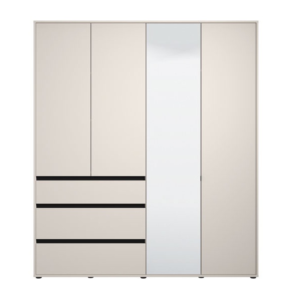 Šatníková skriňa je vyrobená z kvalitných materiálov, ktoré zaisťujú jej dlhú životnosť a odolnosť. Korpus skrine je tvorený 16mm drevotrieskou, ktorá je pokrytá laminom, čo zaisťuje odolnosť voči poškriabaniu a jednoduchú údržbu. Zadná časť skrine je vyrobená z 3mm HDF dosky, ktorá prispieva k pevnosti a stabilite celej konštrukcie. Dvere a zásuvky sú osadené MDF profilmi, ktoré dodávajú skrini moderný vzhľad a zároveň zvyšujú jej odolnosť voči opotrebovaniu. Hrany skrine sú chránené ABS páskou, ktorá zaisťuje odolnosť proti nárazom a predlžuje životnosť skrine.