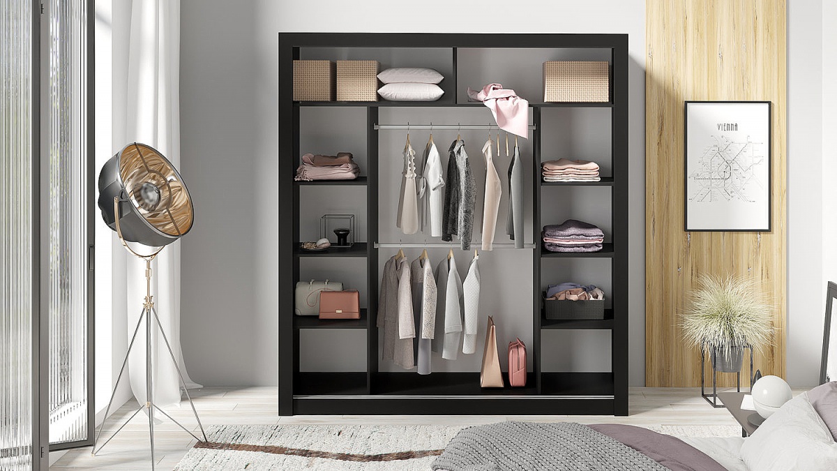 Dvojdverová šatníková skriňa s posuvnými dverami, ktoré sú opatrené koľajnicovým systémom MICRA. Vďaka tomu, že sú dvere posuvné, tak navyše ušetríte miesto. Na ľavej strane sa nachádza zrkadlo. Úchytky v striebornom odtieni sú vyrobené z plastu. Okrem veľkého množstva políc, ktorých nosnosť sa pohybuje medzi 10-15kg, vo vnútri nájdeme aj dve šatníkové tyče. Obrovská plocha úložného priestoru je u tejto skrine úplnou samozrejmosťou.