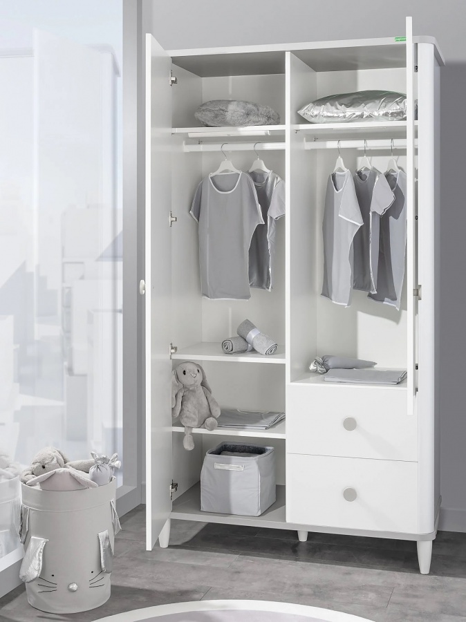 Dvojdverová šatníková skriňa Hippo poteší praktickým riešením. Za oboma dvierkami sa nachádza šatníková tyč a priehradky, do ktorých je možné uložiť oblečenie, obuv, deky a iné doplnky. Za ľavými dvierkami sú umiestnené tri priehradky, za menšími pravými dvierkami je iba jedna, avšak bohato to vynahradzujú dva šuplíky s nosnosťou 15 kg. Pestro vybavený interiér tak možno využiť veľmi rozmanito. Príjemným obohatením je šatníková tyč s LED osvetlením na báze pohybového senzora. U dvierok a šuplíkov užívateľ ocenia systém pomalého a tichého dovierania. Skriňa je tiež netradične, ale veľmi vhodne podopretá piatimi nôžkami.