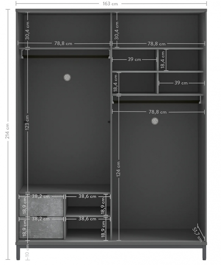 Rozmery šatníkovej skrine 2D s posuvnými dverami Pluto sú 163x214x63,5cm (š, v, h).