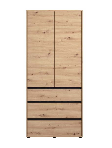 Šatníková skriňa je vyrobená z kvalitných materiálov, ktoré zaisťujú jej dlhú životnosť a odolnosť. Korpus skrine je tvorený 16mm drevotrieskou, ktorá je pokrytá laminom, čo zaisťuje odolnosť voči poškriabaniu a jednoduchú údržbu. Zadná časť skrine je vyrobená z 3mm HDF dosky, ktorá prispieva k pevnosti a stabilite celej konštrukcie. Dvere a zásuvky sú osadené MDF profilmi, ktoré dodávajú skrini moderný vzhľad a zároveň zvyšujú jej odolnosť voči opotrebovaniu. Hrany skrine sú chránené ABS páskou, ktorá zaisťuje odolnosť proti nárazom a predlžuje životnosť skrine.