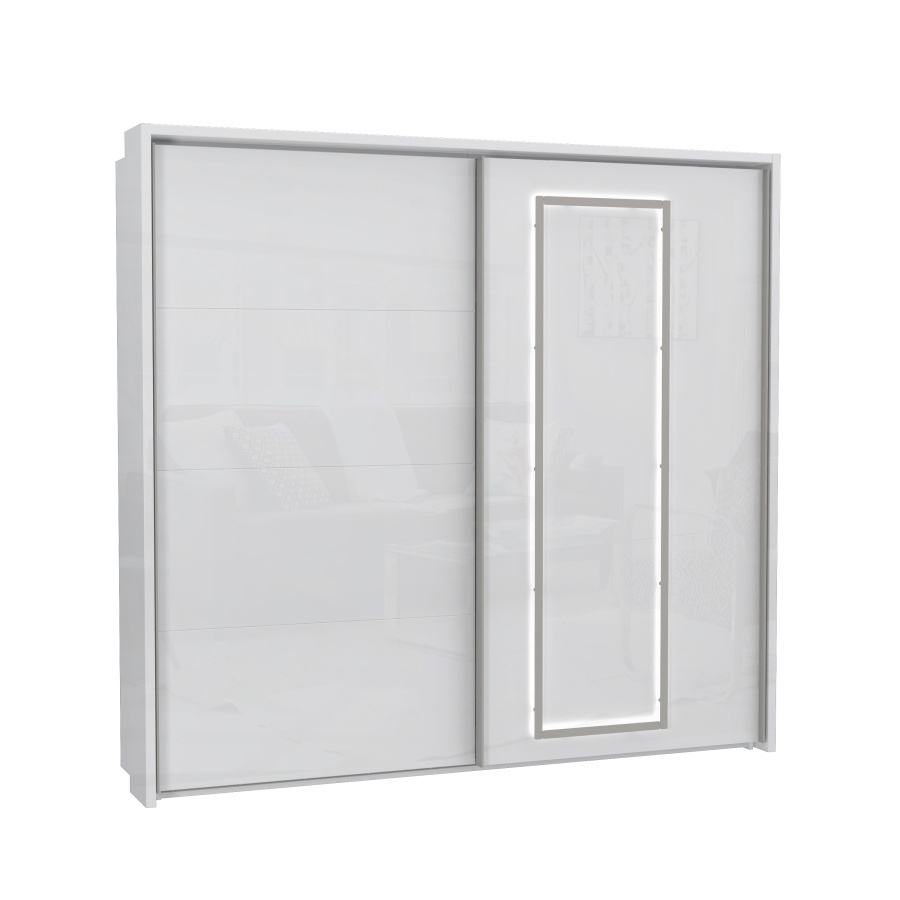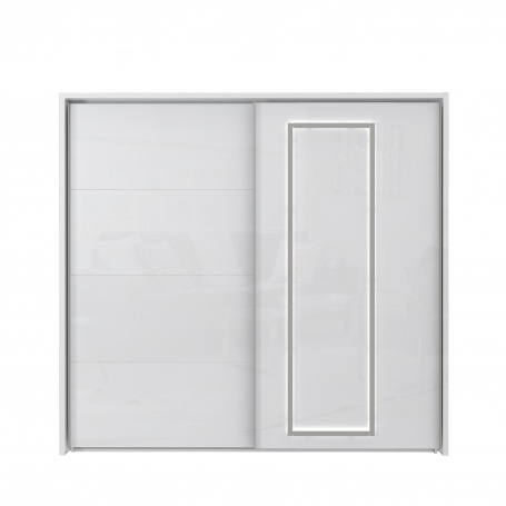 Šatníková skriňa do spálne z radu nábytku Nucleus dokonale rozžiari a oživí celú miestnosť. Luxusný biely povrch vo vysokom lesku dopĺňa LED osvetlenie, ktoré je uschované za štýlovým obdĺžnikovým rámom. Vďaka elegantnému univerzálnemu bielemu prevedeniu padne skriňa do každej miestnosti. Produkt je ideálnou voľbou aj do menších interiérov, pretože ponúka pomerne objemný úložný priestor a zároveň disponuje zasúvacími dverami, ktoré nezaberajú miesto navyše. Úložný priestor je rozdelený na dve hlavné časti. Ľavú polovicu tvoria široké police na uloženie skladaného oblečenia. V pravej časti nájdete okrem hornej police aj šatníkovú tyč, vhodnú na zavesenie kabátov, košieľ či šiat.