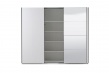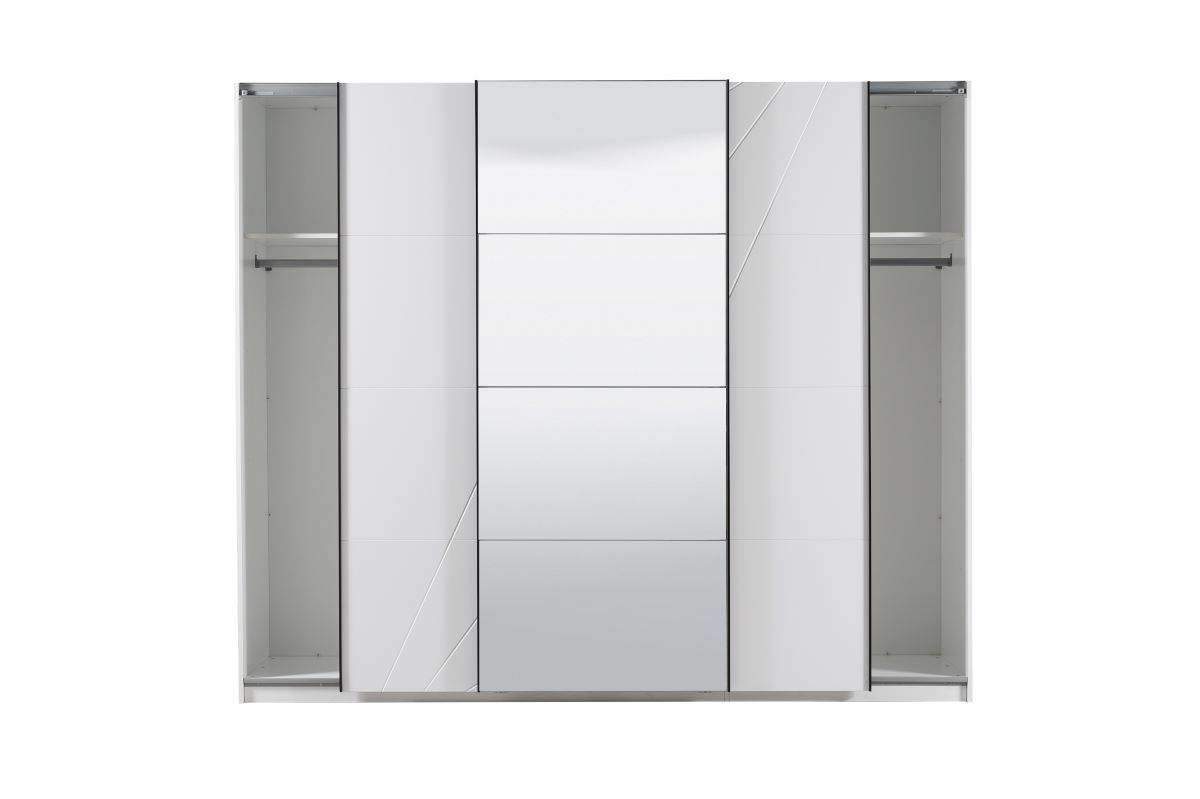 Vnútorné usporiadanie skrine je pevne dané. A to jedna šatníková tyč vľavo i vpravo a štyri police na skladané bielizeň uprostred. Nad každou z šatníkových tyčí vás poteší tiež jedna široká polica. Veľké zrkadlo na skrini opticky rozšíri priestor a celá spálne bude zrazu vyzerať oveľa väčšie. Ponúka sa tiež možnosť pridania spomaľovače zatvárania bočných dverí a tiež rámu s osvetlením.