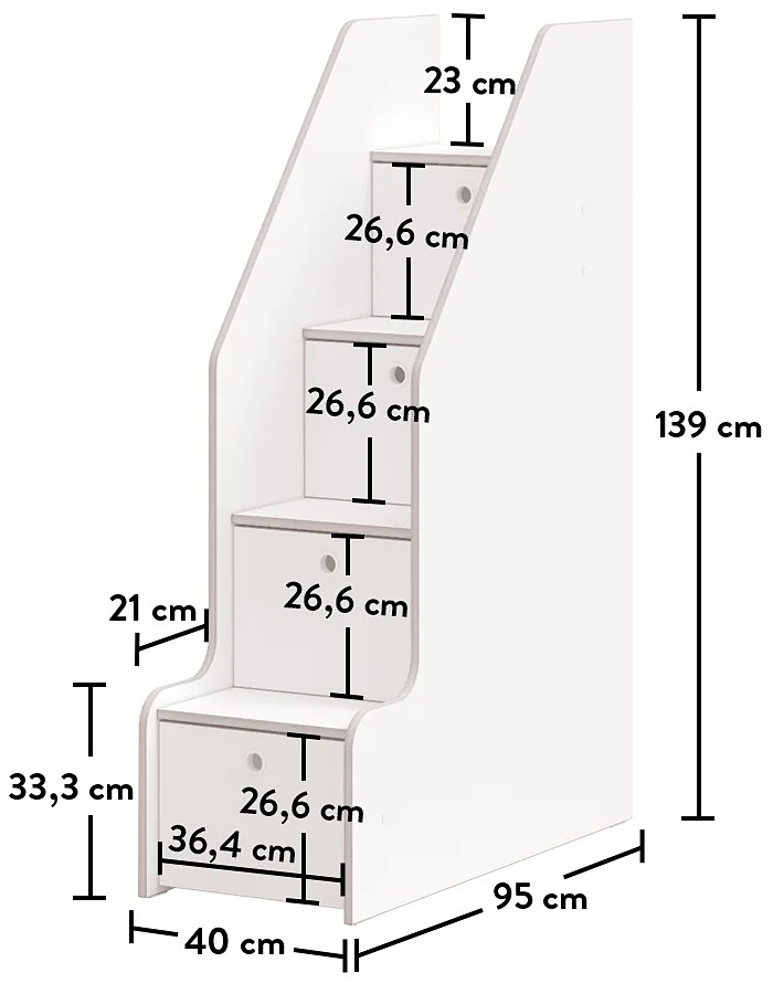 Schodíky Modular sú inovovaným modelom, ktorý vystupuje do popredia svojou funkčnosťou aj eleganciou svojho dizajnu. Určené sú primárne k poschodovej, vyvýšenej a multifunkčnej posteli Modular, avšak použiť ich je možné aj samostatne. V schodíkoch sa nachádzajú úložné priestory s výklopnými dvierkami. Zaoblené hrany a rohy maximalizujú bezpečnosť vás aj vašich detí a ich prúžkový efekt príjemne ladí s laminom v bielej farbe.
