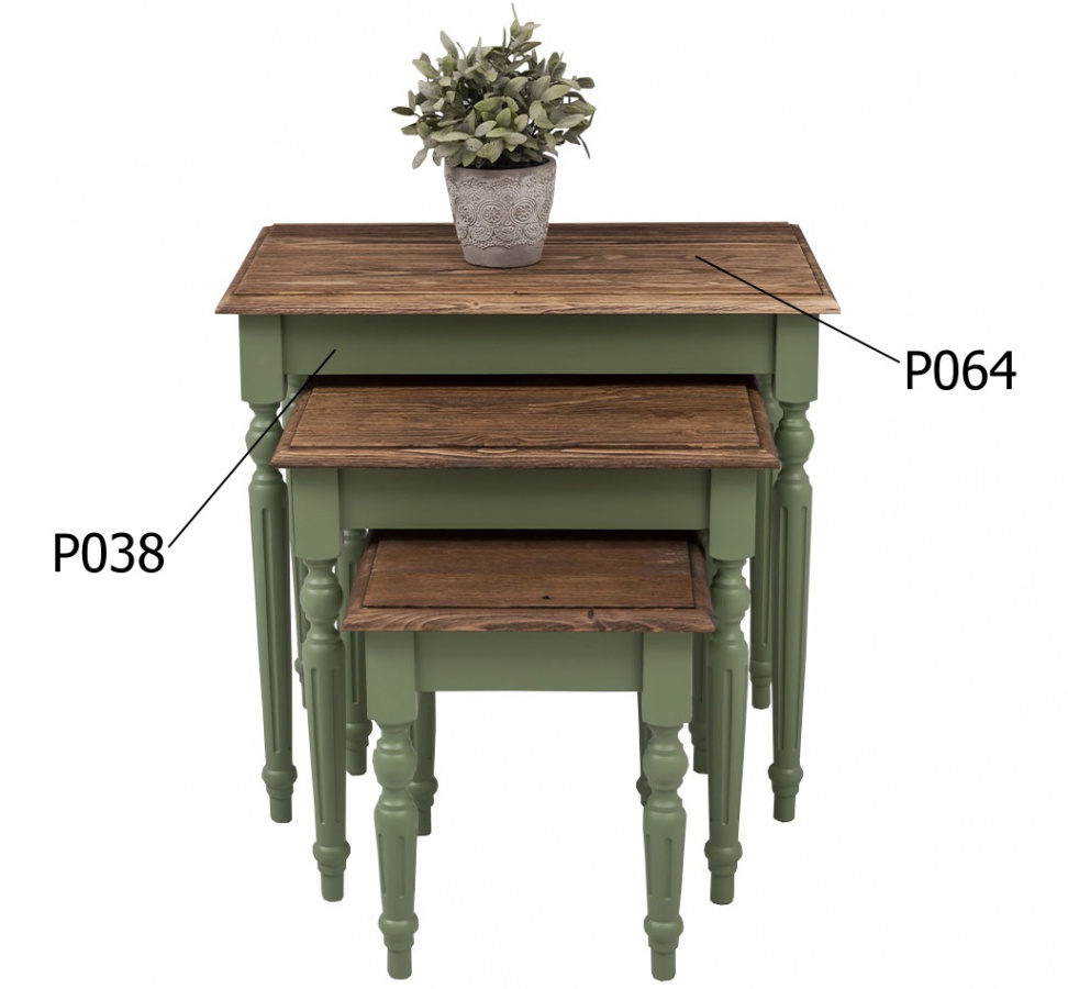 Odkladacie stolíky z poctivého borovicového dreva sa hodia ako do obývacej izby, tak napríklad do predsiene. Korpus stolíka je pokrytý farebným náterom v odtieni P038, horná doska je upravená spôsobom hlbokého kefovania v odtieni P064. Použité sú výhradne ekologické farby na vodnej báze. Farby sú kvalitné, certifikované a netoxické, vďaka tomu je možné ich aplikovať aj na nábytok určený do detských izieb.