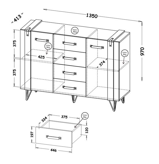 Čo sa týka úložného priestoru, môžeme komodu rozdeliť na tri časti. Ľavá časť je rovnako široká ako pravá. Obe sú opatrené dvierkami, za ktorými sa skrýva vždy jedna polica, deliaca priestor horizontálne presne v polovici (37,5cm je výška každého výklenku). Každá z týchto políc má nosnosť 5kg. Môžete si tu uložiť skladané oblečenie, náhradné deky, rovnako ako šanóny s osobnými dokumentmi či spoločenské hry. Uprostred nájdeme 4 zásuvky s max. Nosnosťou 3kg, ktorých vnútorný priestor je 37,5x12x33,4cm (š, v, h). Na hornú odkladaciu plochu s nosnosťou 15kg môžete rozmiestniť obľúbené fotografie, dekorácie či kvetináč s izbovou rastlinou.