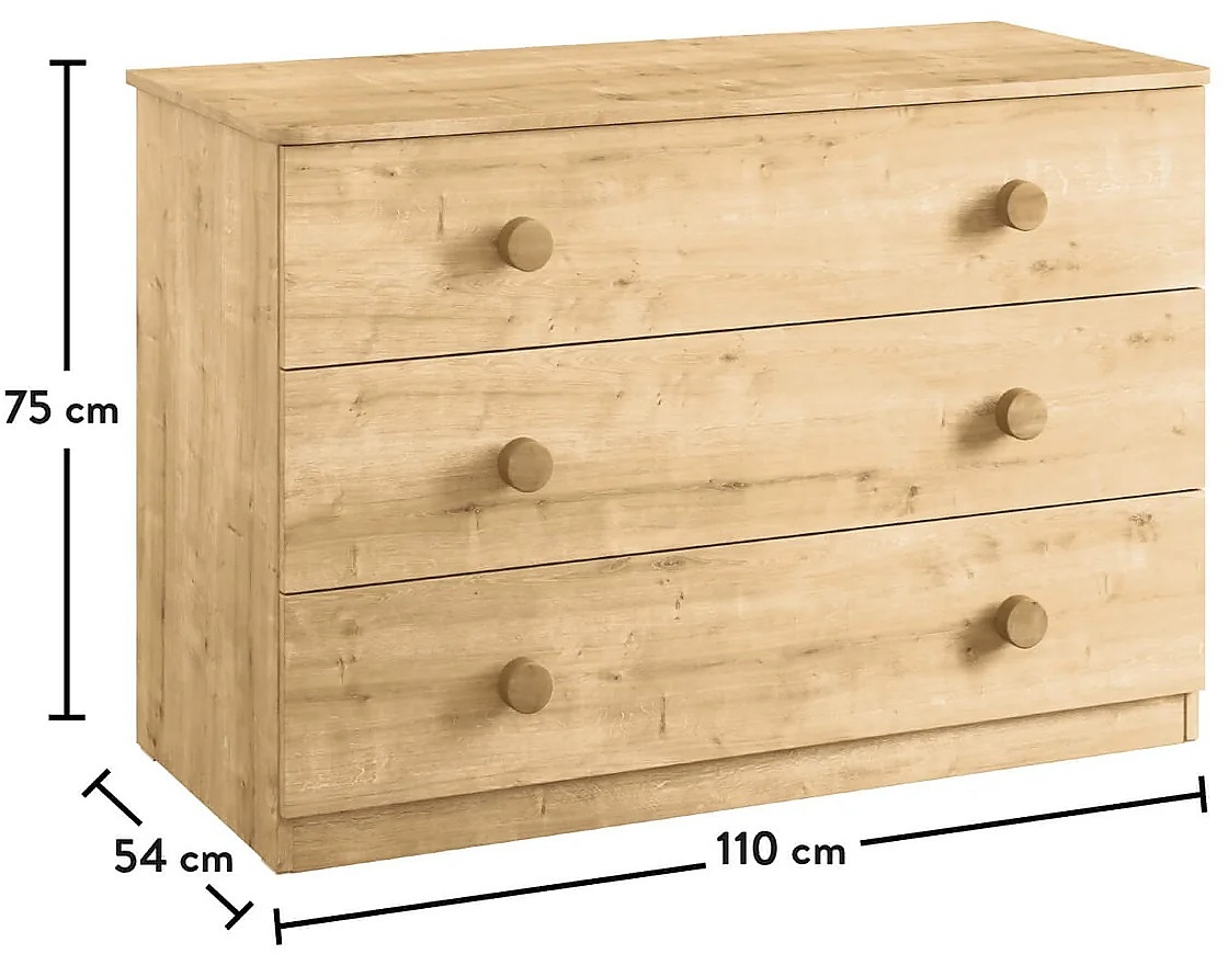 Komoda poskytne k uloženiu tri praktické zásuvky na kvalitných koľajničkách. Do zásuviek môžete uložiť oblečenie, posteľnú bielizeň a ďalšie ľubovoľné príslušenstvo. Komoda je vyrobená z kvalitného lamina, ktoré poteší dobrou mechanickou odolnosťou a jednoduchou údržbou. Rozmery široké komody Cody sú 110x75x54cm (š, v, h).