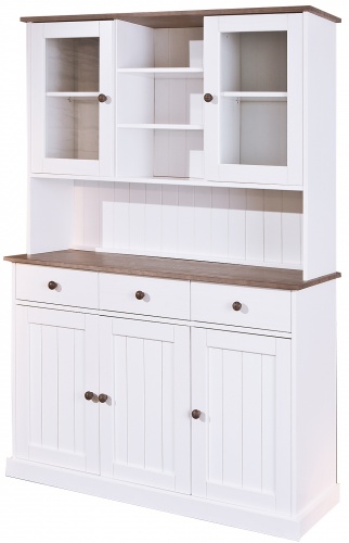 Široký kredenc perfektne zapadne ako do kuchyne, tak do jedálne. Využijete ho ako na riad, tak hrnce či príbory a iné potreby na varenie. Za presklenými dvierkami v hornej časti sa skrýva priestor rozdelený policou, čím vznikli na každej strane dve priehradky. Medzi nimi sa nachádza otvorený priestor s policami. V dolnej časti nájdete priestor s policami, ktorý sa skrýva za plnými dvierkami. Do troch zásuviek môžete zaobstarať organizéry, a tak si ešte vylepšiť úložný priestor. Navyše oceníte aj hornú dosku, ktorá taktiež ponúka obrovský odkladací priestor.