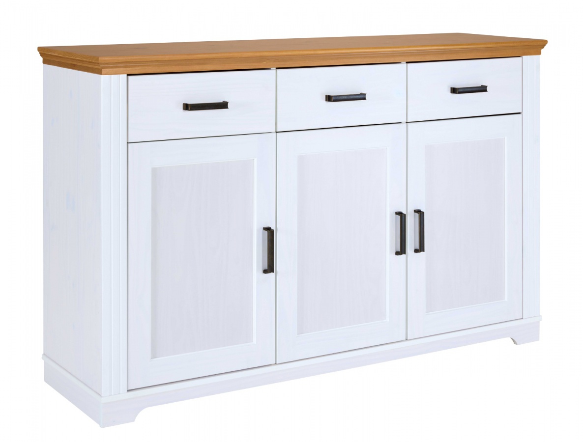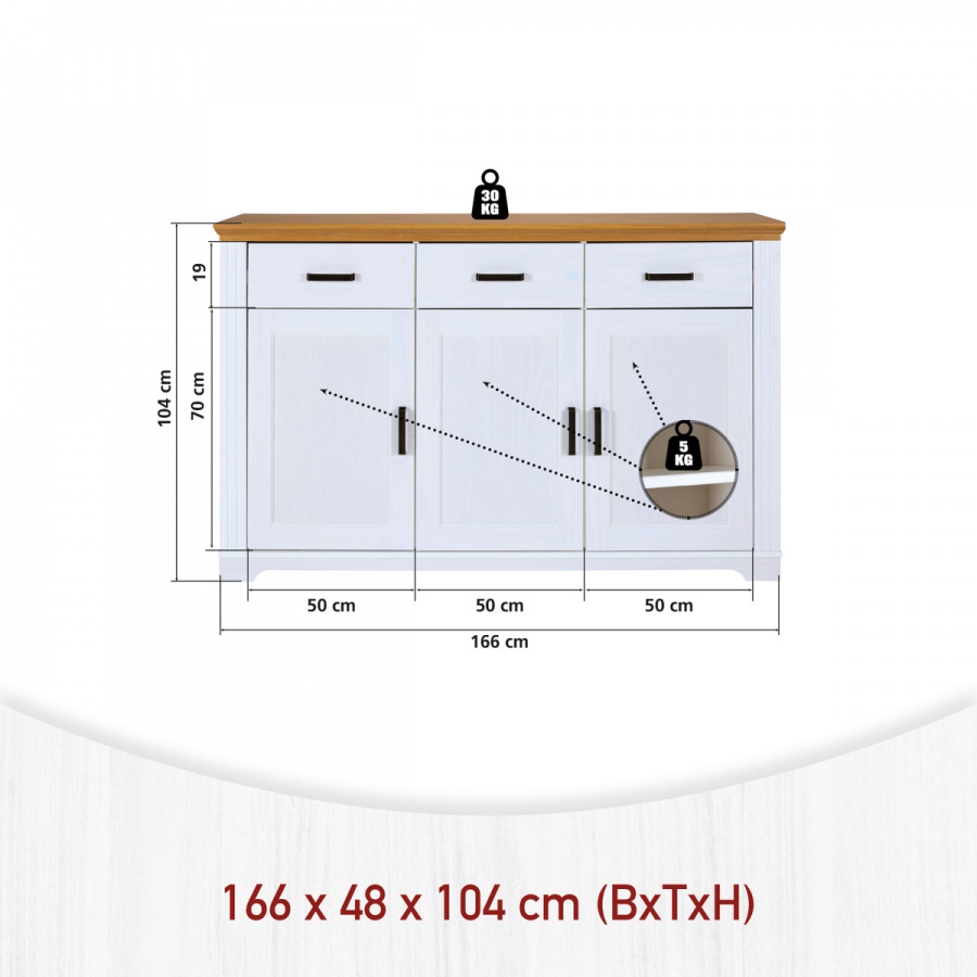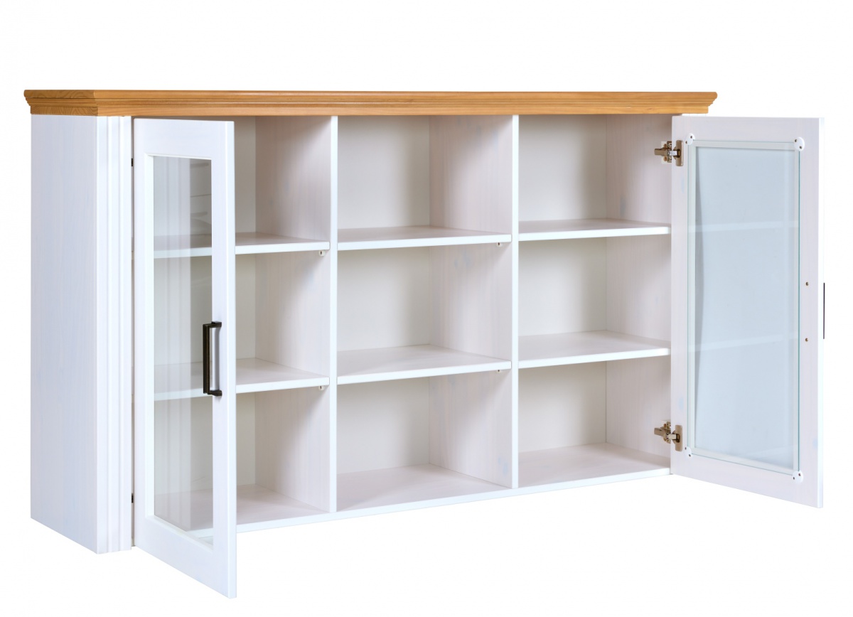 Široký kredenc Malcolm vo farebnom prevedení biela/dub spája nadčasovú eleganciu a praktické členenie. Spodnú časť tvorí komoda s tromi zásuvkami a tromi skrinkami; horná časť je presklená vitrína s dvoma dvierkami a dvoma otvorenými policami medzi nimi. Vyrobený z masívnej borovice (Pinus Taeda) s pevnou, UV lakom chránenou povrchovou úpravou, ktorá zvýrazňuje prirodzenú kresbu dreva a skvele sa udržuje. Silná rímsa cca 54 mm s útulným frézovaným profilom v jedinečnom odtieni Oak Colori dodáva charakter.