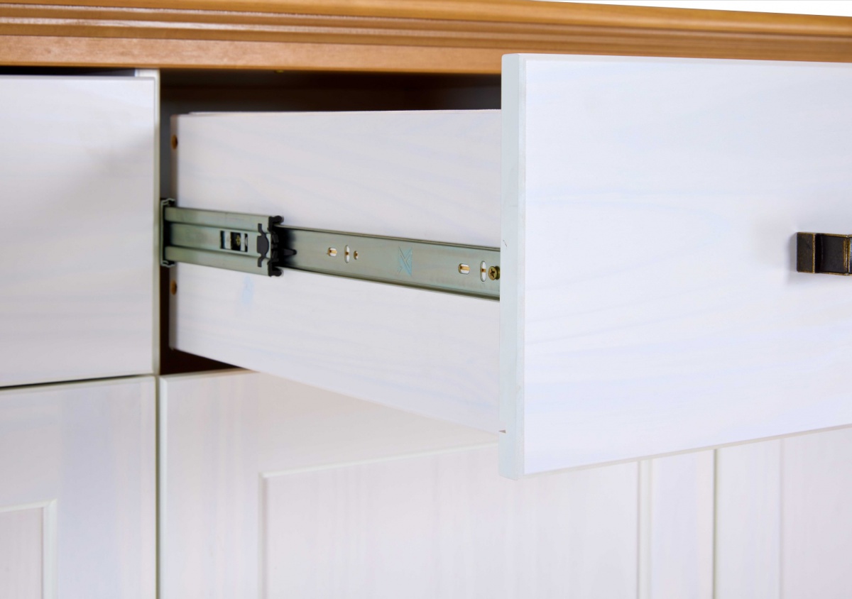 Masívne kovové úchytky a kovové výsuvy zaisťujú dlhú životnosť. Dvierka aj zásuvky majú tlmené dovieranie; dvierka sa pri ľahkom zatlačení automaticky zavrú – tichý, prémiový komfort. Predné plochy zdobia krásne zvislé lišty a profilované kazetové dvierkové rámy.