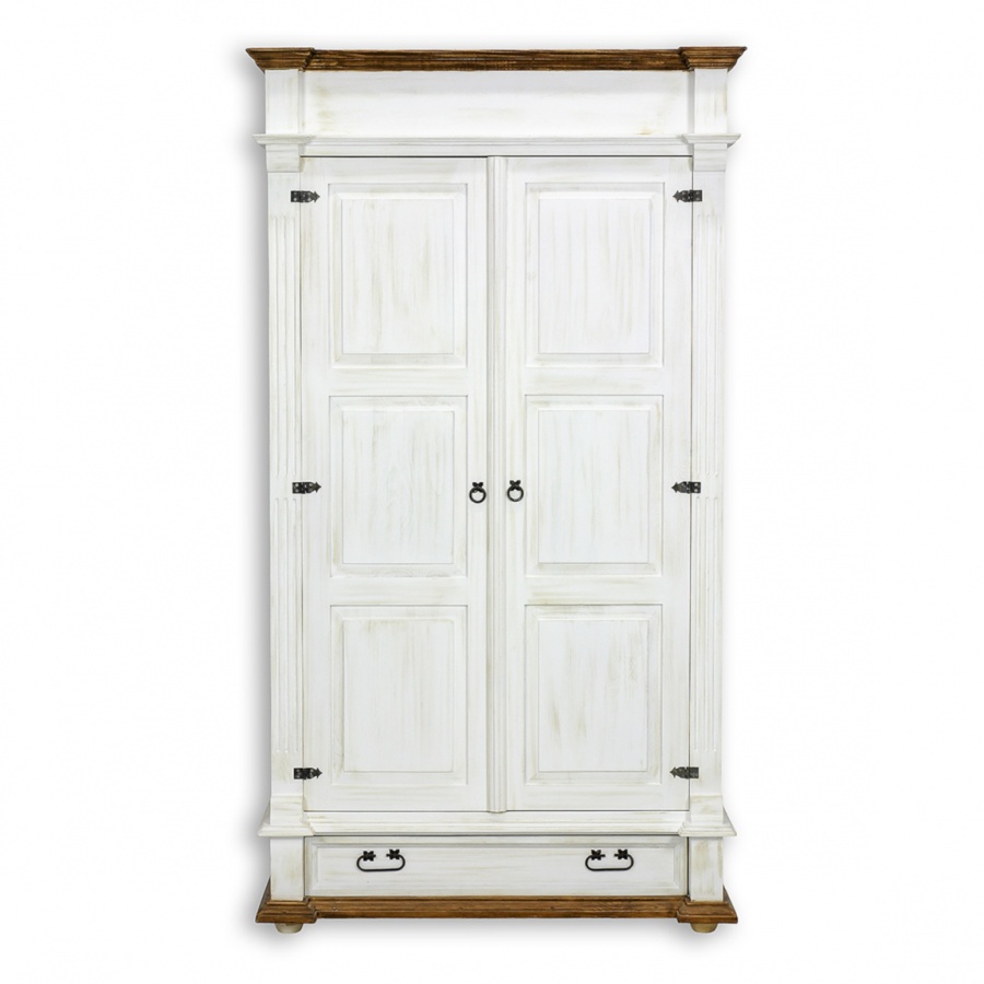 Viete, čo vášmu oblečeniu naozaj pristane? Jednoznačne masívny šatník z borovicového dreva. Pustite medzi svoje šaty vôňu prírody. Tešiť vás bude nielen úložný priestor, ale aj samotná skriňu vo vidieckom štýle. Takmer dvojmetrová robustná skriňa znesie časté používanie aj vysokú záťaž. Má veľmi odolnú, robustnú konštrukciu, pritom stojí na dekoratívnych okrúhlych nohách. Veľmi dekoratívne je tiež frézovanie dreva. Úchyty sú kovové, pričom kovanie je ozdobené umeleckou patinou. Súčasťou skrine sú tiež dva praktické šuplíky.